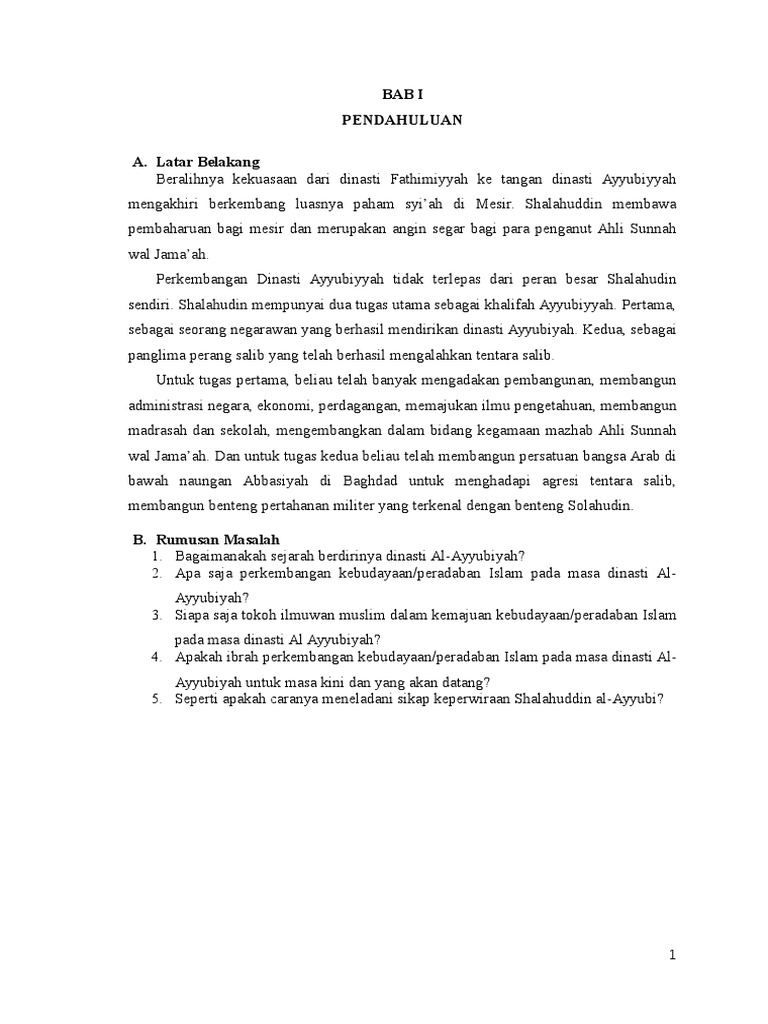 Pada itu masyarakat islam telah mencapai puncak kemulian, baik dalam bidang ekonomi, politik, peradaban dan kekuasaan pada masa kekuasaan bani abbas yang pertama. Sejarah pendidikan islam masa bani umayyah sejarah pendidikan islam pada hakekatnya sangat berkaitan erat dengan sejarah islam. Kemajuan ilmu pengetahuan pada masa dinasti bani abbasyiah. Ia dikenal sebagai panglima perang yang gagah berani dan disegani, juga seorang yang sangat memperhatikan kemajuan pendidikan. Tampak bahwa kemajuan pendidikan yang dialami ummat islam masa itu tidak mengenal dikotomi atau sekularisasi ilmu, duniawi dan ukhrawi, melainkan integrasi keilmuan tanpa memandang objek kajian. Kemajuan di bidang militer daulah turki usmani tidak diimbangi dengan kemajuan di bidang teknologi dan sains. Kemajuan² di bidang pendidikan,ekonomi/perdagangan,militer/sistem pertahanan,adalah kemajuan pada masa dinasti ayyubiyah yang berhasil menjadikan damaskus sebagai kota pendidikan pada masa. Pada masa pemerintahan daulah abbasiyah perkembangan di bidang pemerintahan telah mengalami kemajuan yang sangat pesat. Ibnu jubair yang mengunjungi damascus pada tahun 1184 m, mendapati sekitar 20 madrasah dan 2 rumah sakit bebas beaya di. Di antara tokoh di bidang ilmu hadits yang sangat terkenal saat itu adalah: Pada masa pemerintahan daulah ayyubiyah sudah dibangun beberapa pabrik yang memproduksi. Daulah abbasiyah yang berlangsung 5.5 abad secara politis bisa dikatakan hanya mampu dapat mendirikan selama satu abad yaitu selama periode pertama. Rumusan masalah berdasarkan uraian di atas dapat ditarik.